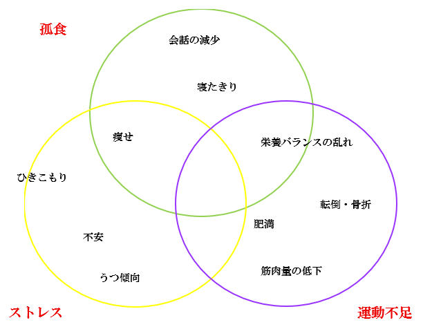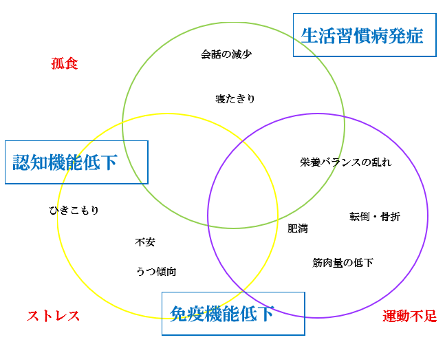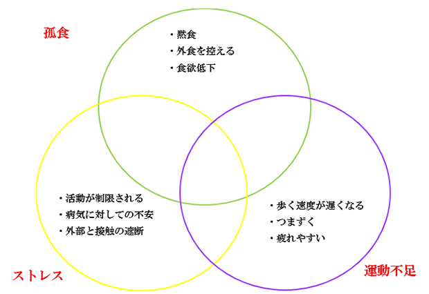 感染対策のための外出自粛によって、これまでより身体活動量が減少し、その結果、ほかの病気などの発症や悪化、認知機能の低下など引き起こす状態